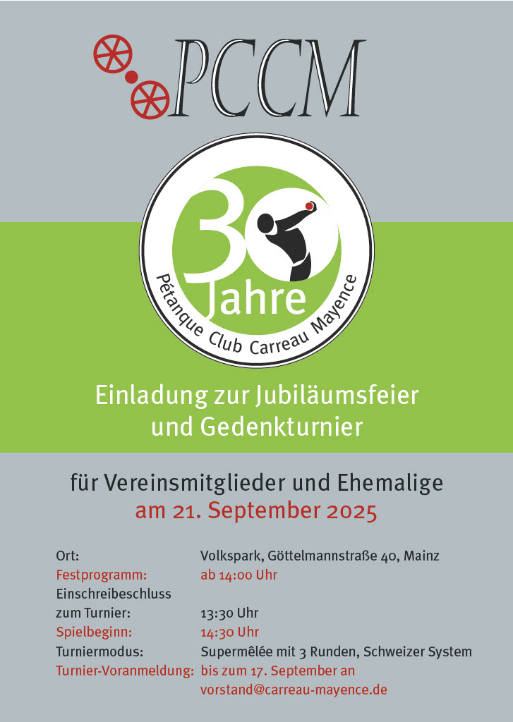 30 Jahre PCCM 14. September 2025 Aus Von Bea Vereinsmitglieder und Ehemalige feiern und spielen gemeinsam am 21. September 2025 im Volkspark DIN_A3_Plakat_30_Jahre_PCCMHerunterladen
